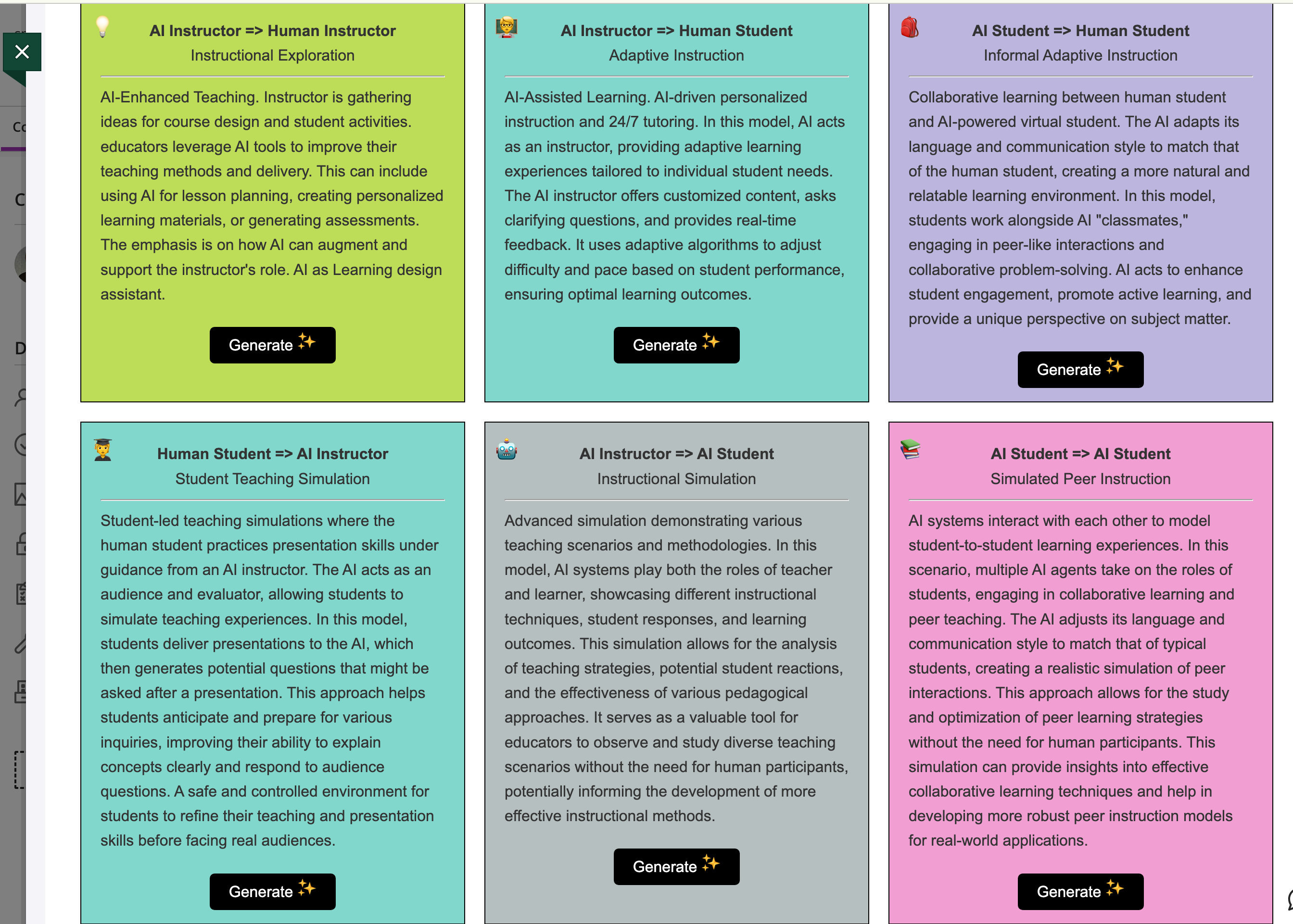 Example: AI Instructor advising Human Instructor on course design. AI Instructor using adaptive teaching with Human Student. AI Student and another AI Student simulating peer instruction.