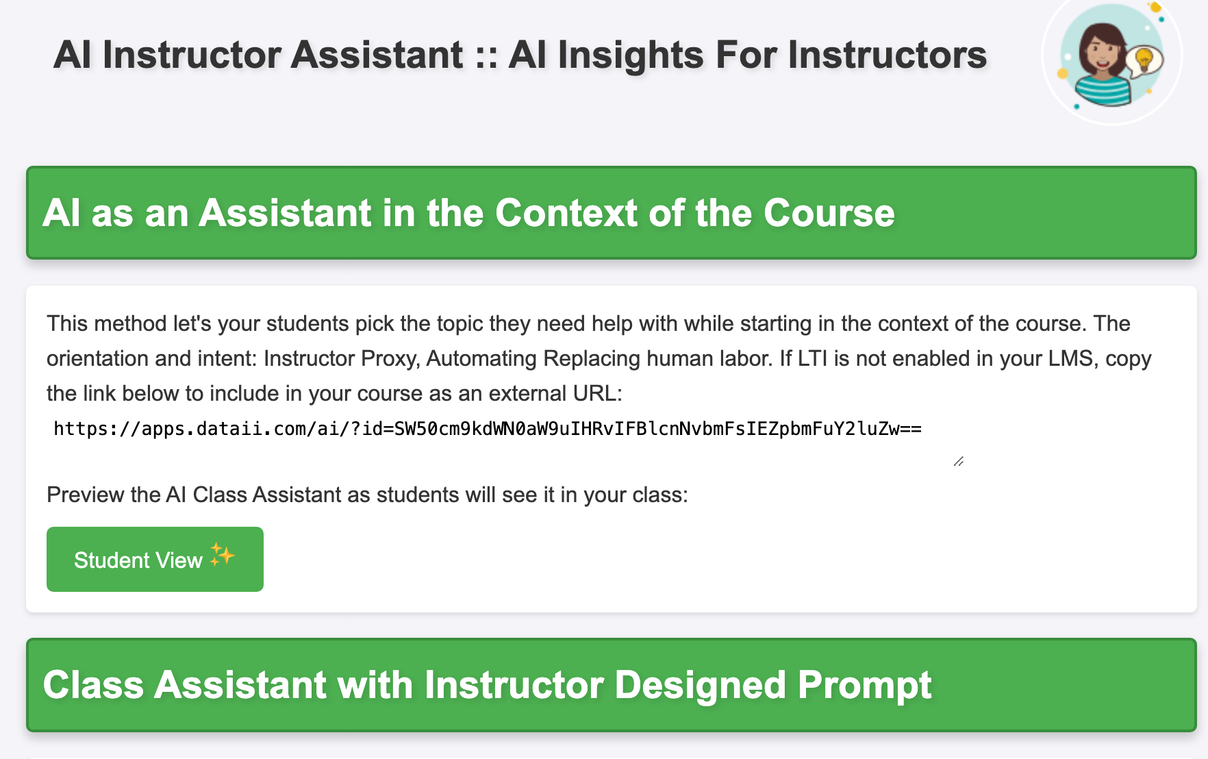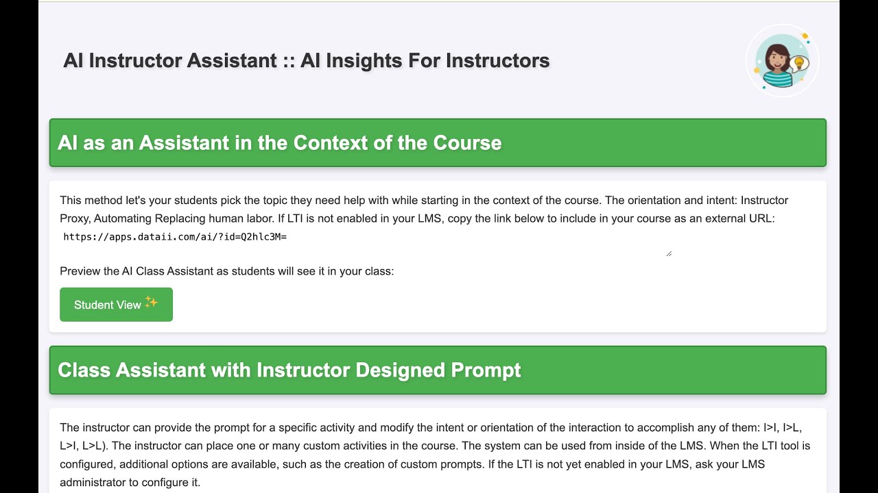 The AI Instructor Assistant is a tool designed to enhance teaching and learning experiences in higher education. This versatile platform integrates seamlessly with Learning Management Systems (LMS) or can be used independently, offering both instructor and student-focused features. For instructors, it provides course-specific assistance, including generating tailored assignment ideas, previewing AI-assisted learning experiences, and exploring AI-generated content relevant to their subject matter.