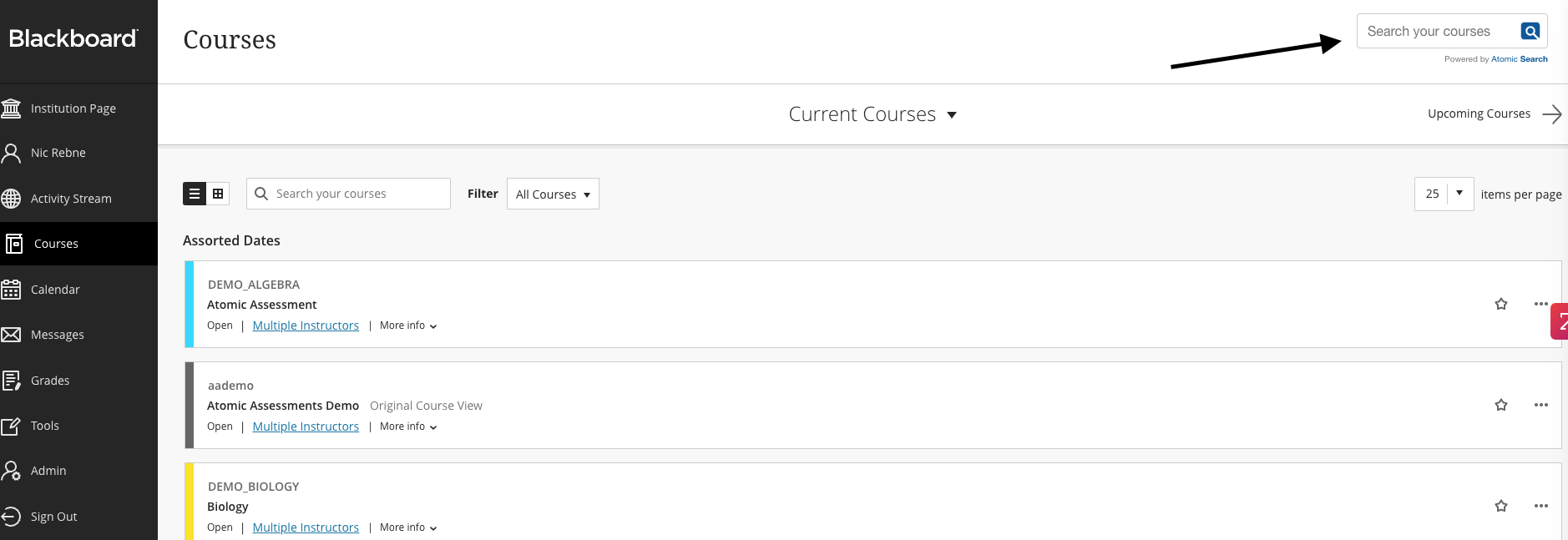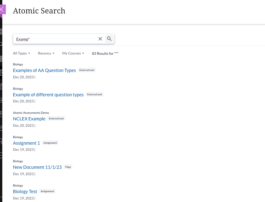 Atomic Search is an LTI Advantage tool that seamlessly integrates with your Blackboard Learn LMS. It helps you quickly and easily find pages, files, assignments, discussions, modules, or any content within your files.