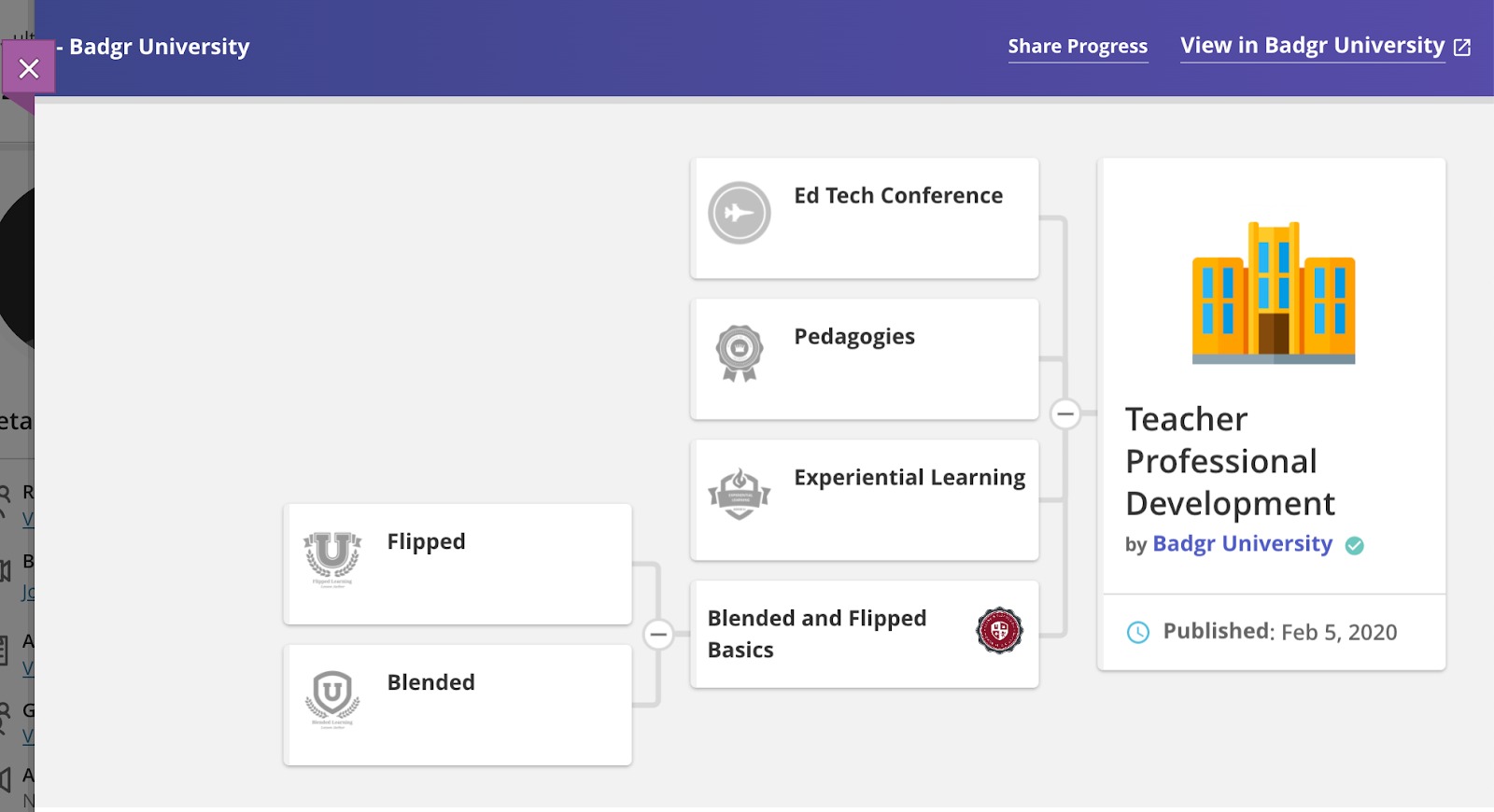 No matter how many learners are included in your Blackboard Learn instance, Badgr Spaces tracks every award and presents users with visual maps of their progress using Badgr's intuitive pathways tool.