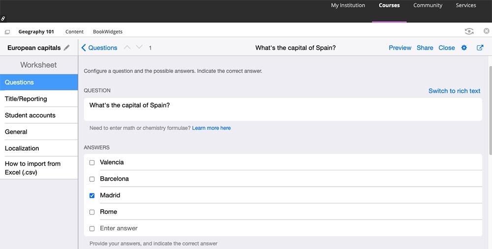 Choose from over 40 exercise templates (quizzes, crosswords, jigsaw puzzles, ...), and adapt them with your own content.