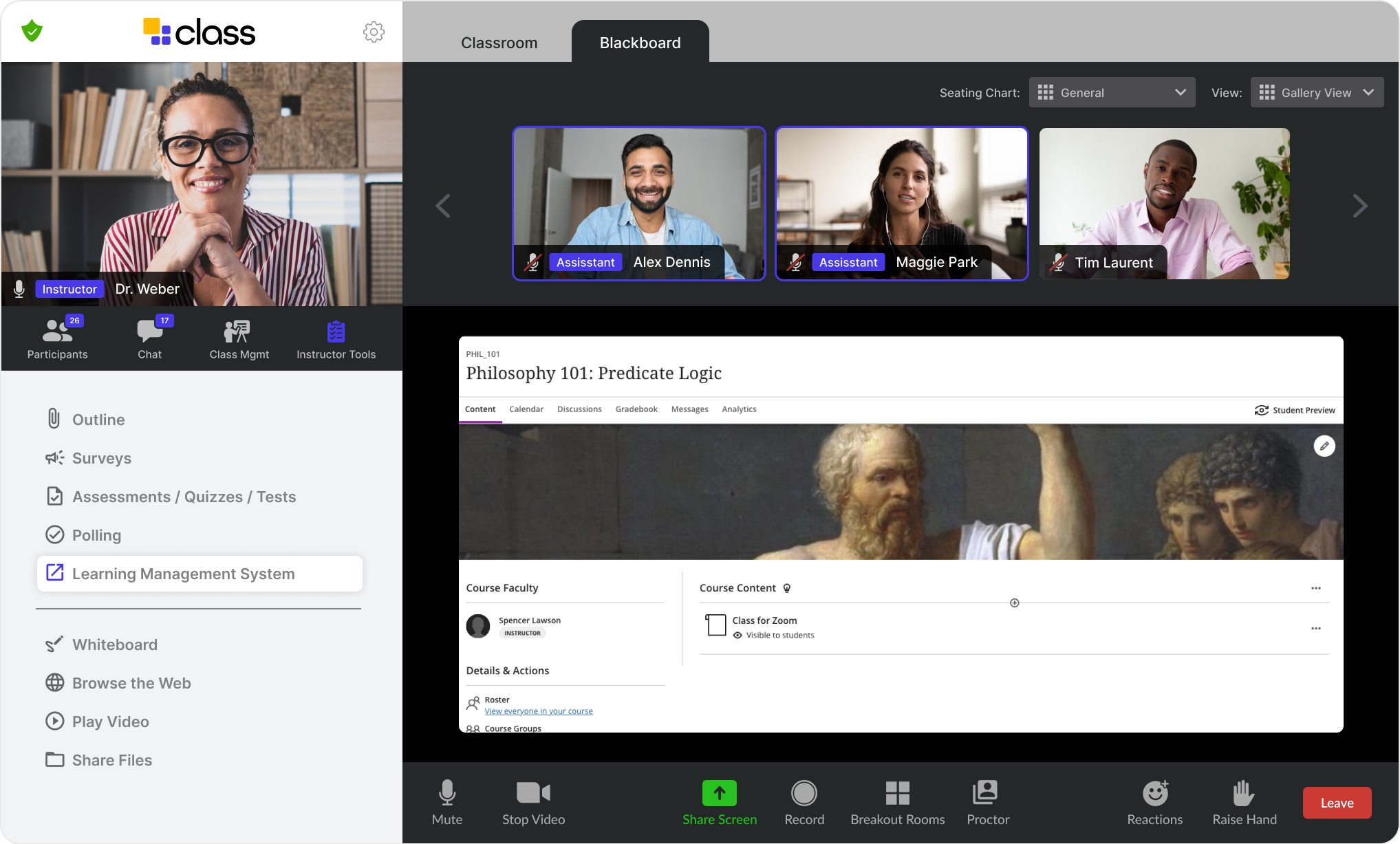 The LTI application integrates Class into Blackboard Learn via the LTI standard (v1.1 + v1.3). Specific features include: