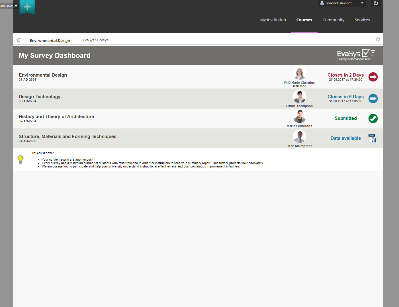 Students have a dashboard providing survey information in a rich and customizable content. Visual indicators have been incorporated to encourage students to take their surveys. Instructors get response rates of their surveys throughout the evaluation period to help them encourage their students to participate. The evasys tool can be configured to provide access or not to course evaluation results such as PDF or CSV and can be displayed directly into BlackBoard.