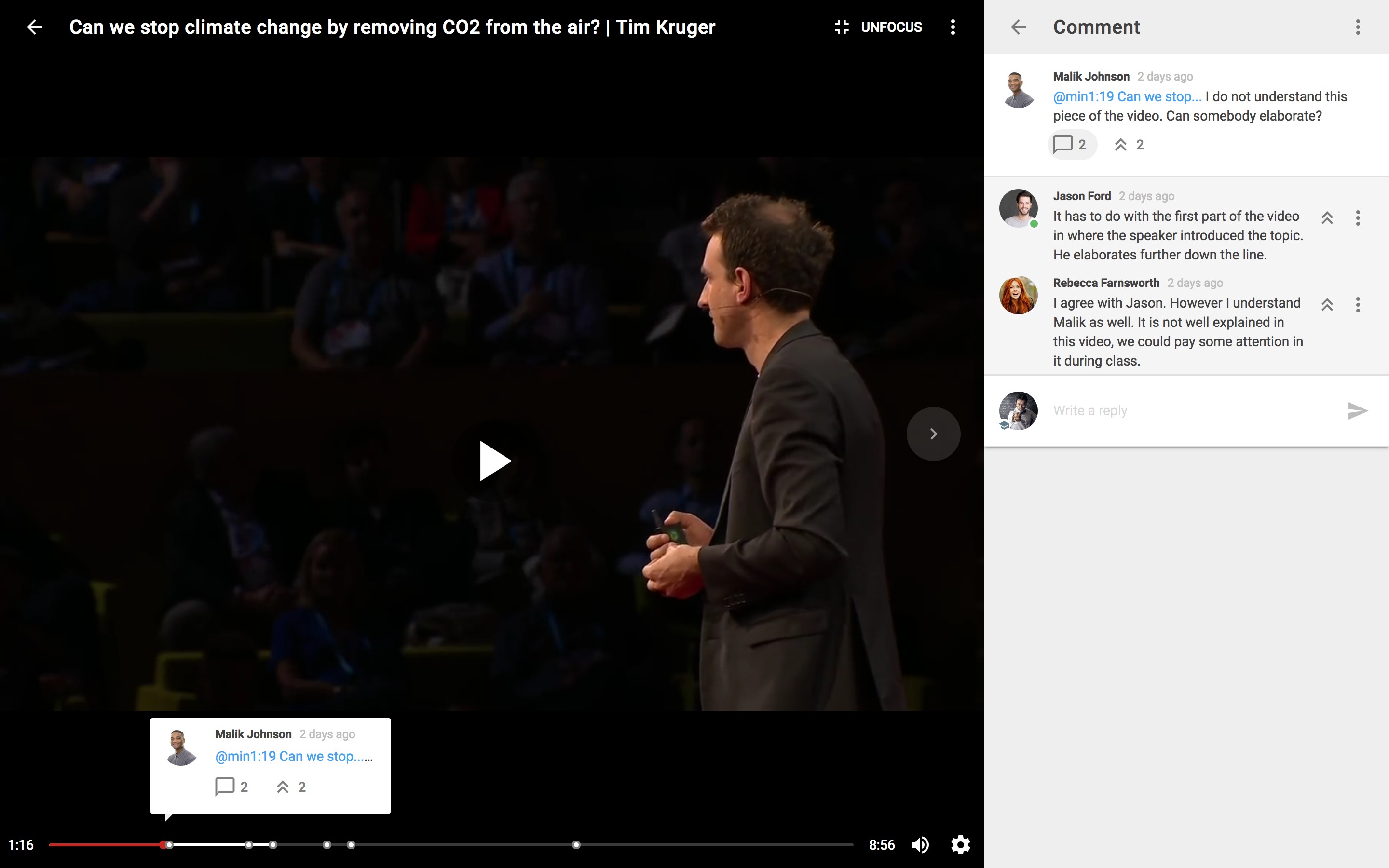 Videos are a powerful way for students to understand and visualise concepts, yet, too often students are only passively consuming the content. By adding interactivity, deeper learning is enabled, as well as the possibility for deeper reflection on relevant topics. There is also a social element, so students can share knowledge in a fun and engaging way. There are many learning activities teachers can organise using this Interactive Video tool. Examples are: