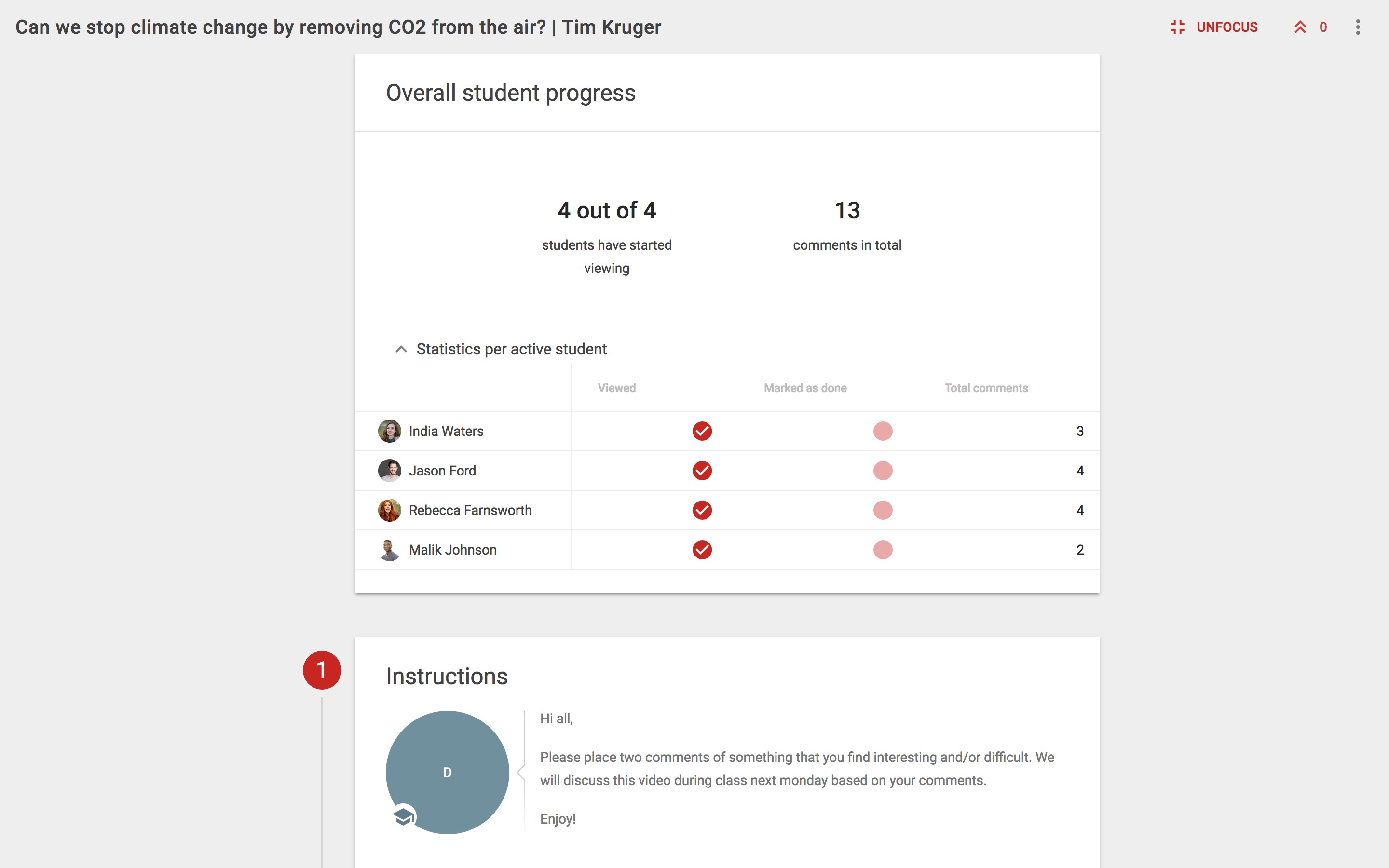 The teacher sets a video assignment that encourages students to share their perspective by answering interactive practice moments and starting or participating in discussions in an active way.