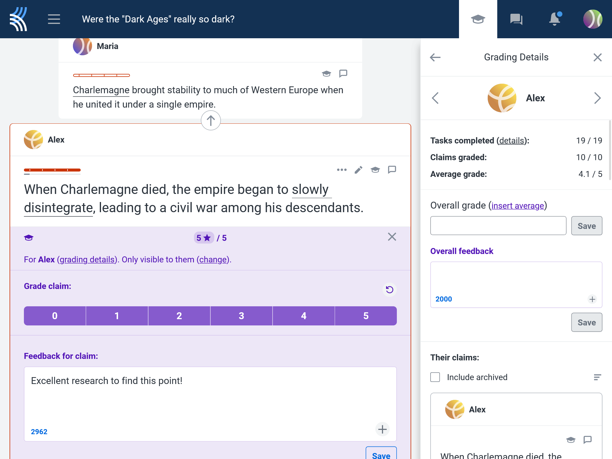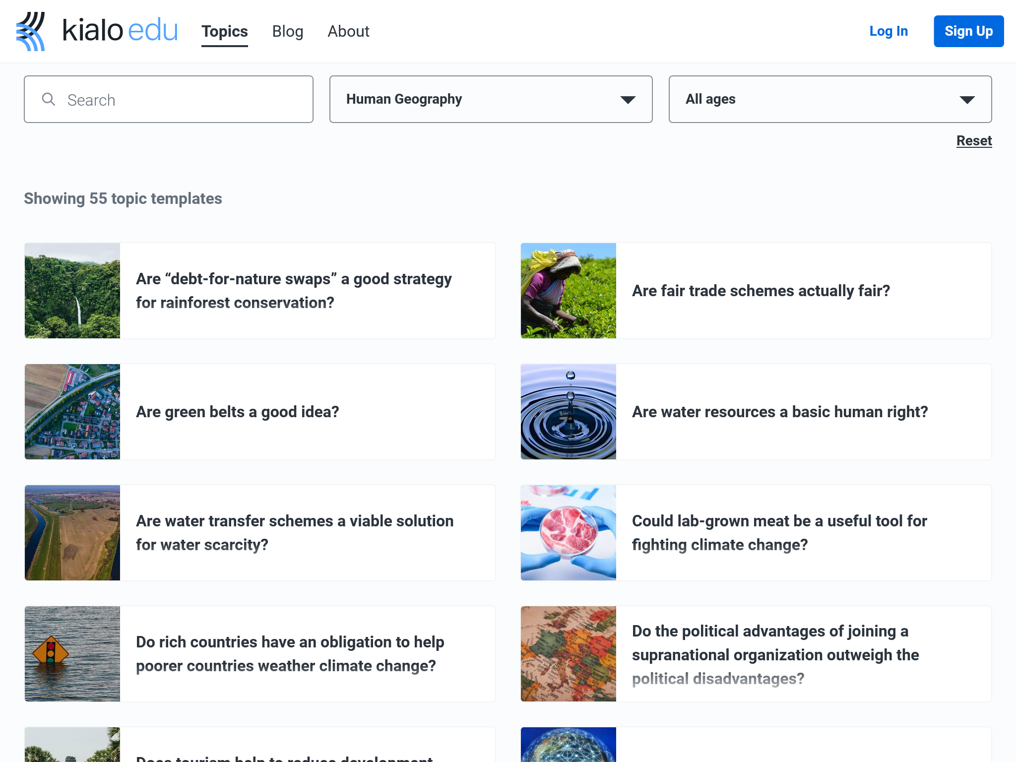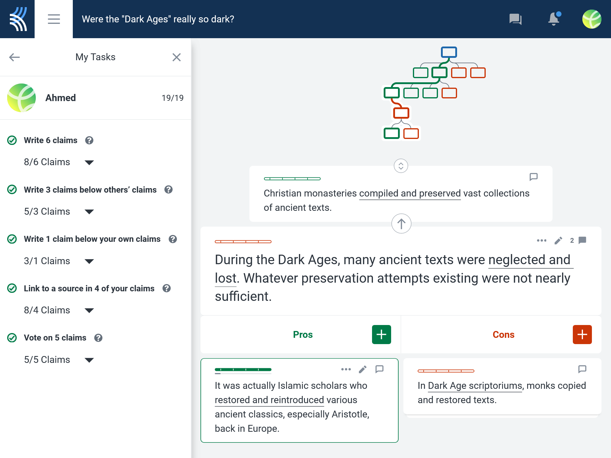 Kialo Edu is all about supporting educators, which is why we have an enormous library full of ready-to-go discussion resources, a built-in Grading tool, a Tasks feature to keep track of student progress, and much more!