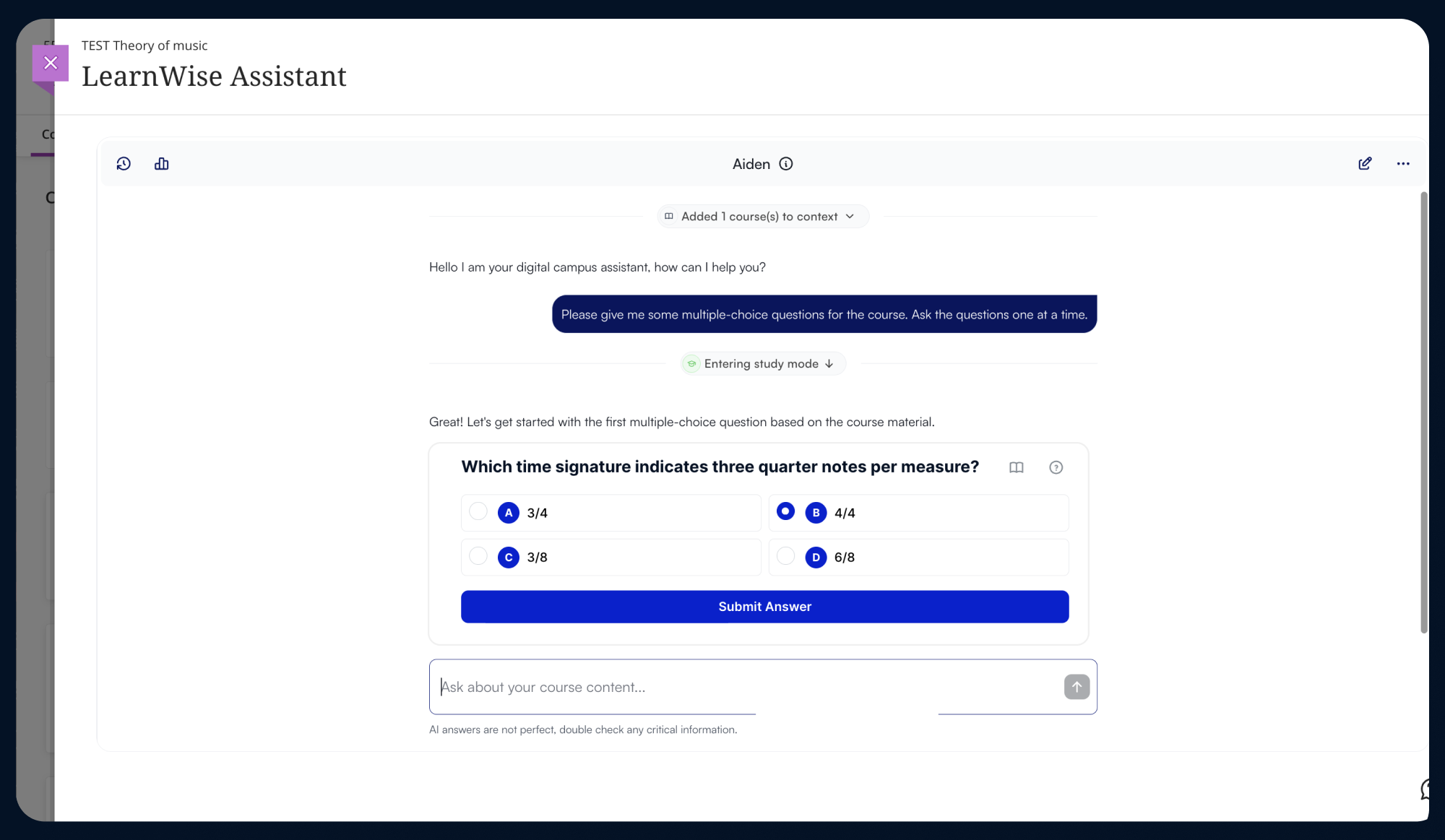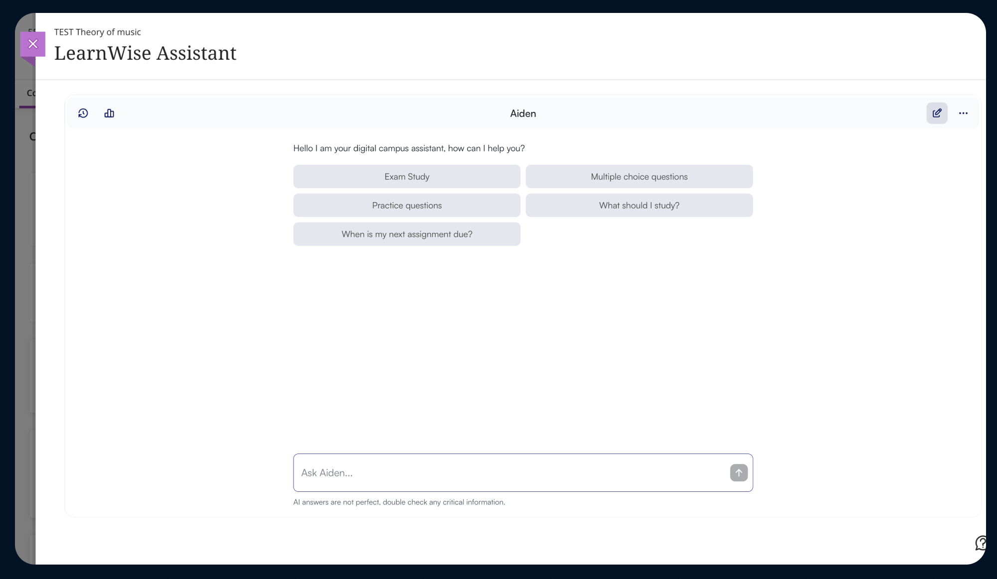 LearnWise is your AI campus assistant in Blackboard, offering 24/7 multilingual support and personalized tutoring on course content.