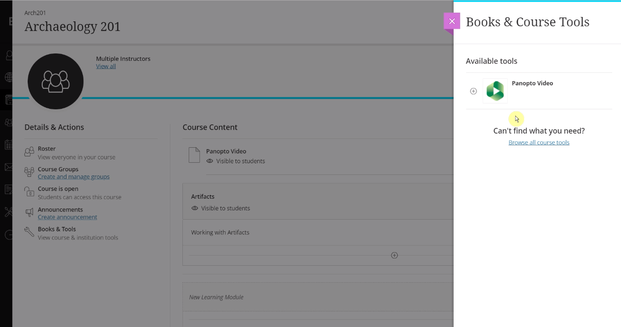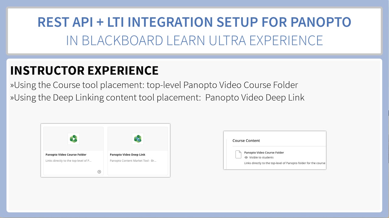 Panopto now offers an integration with Blackboard Ultra. This integration allows instructors to easily access Panopto from inside their courses and quickly record, upload and manage videos. Students can now automatically see content created by instructors. The articles below will outline special features offered with Blackboard Ultra.