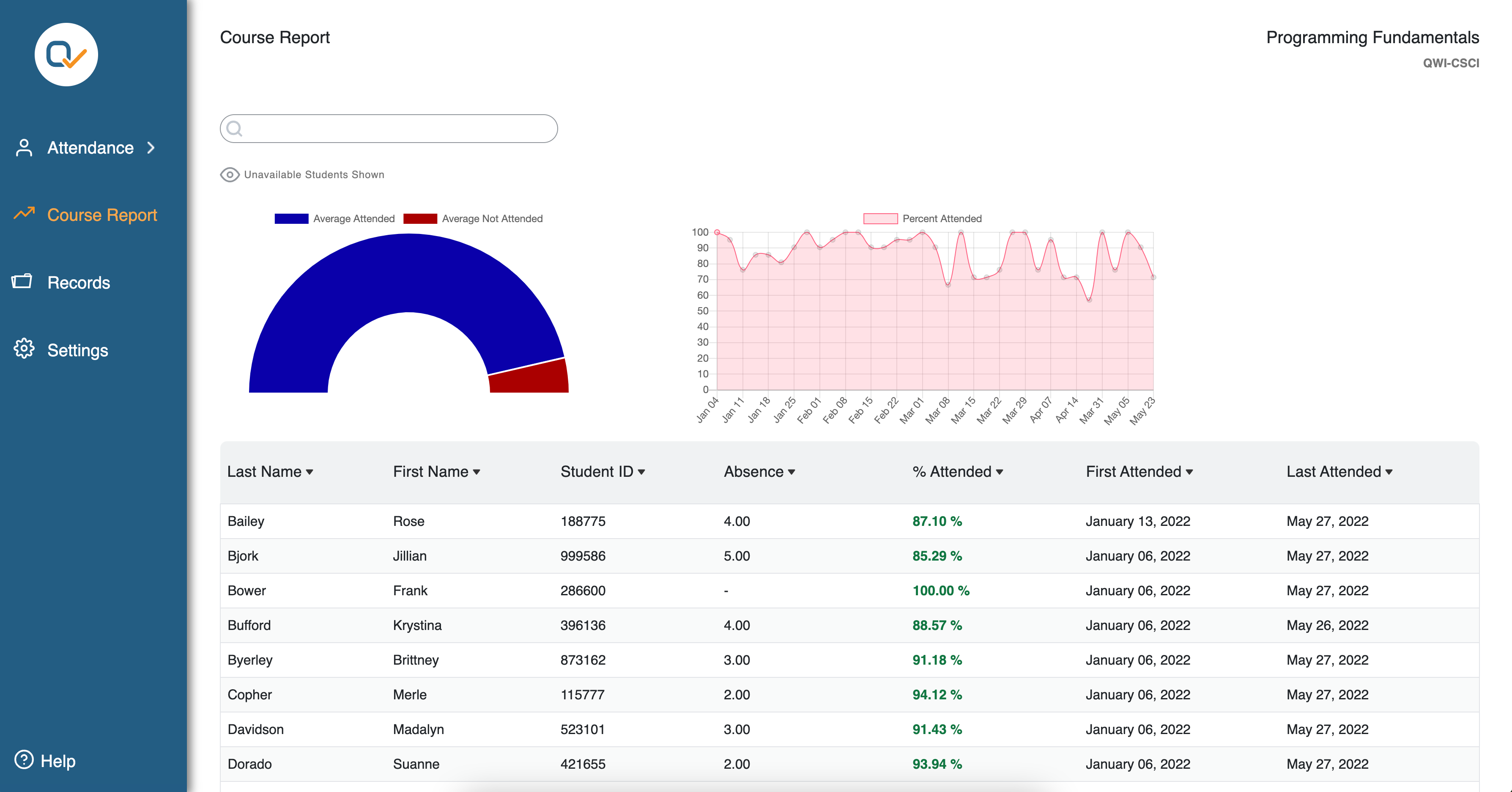 Qwickly Attendance Pro: Transform the use of institutional attendance data with Qwickly Attendance Pro. With a variety of robust reporting capabilities, administrators can target attendance data by class, student, specific time period, and customized group (such as athletes or at-risk students.) Adaptive features have allowed for numerous use-cases, including SIS integration via a data feed creator and enrollment verification for use in financial aid departments. The Qwickly Attendance Pro platform design ensures future development to meet specific needs & requests.