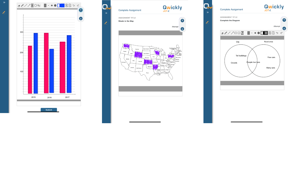 Qwickly Jot allows students to write on diagrams, charts, maps, and more inside Blackboard. Instructors can create an assignment to identify countries on a map, diagram the chemical bonds of a water molecule, or endless other interactive options. Once the assignment is uploaded, students write directly on the assignment using a touchscreen & stylus or mouse/trackpad to submit their answers.