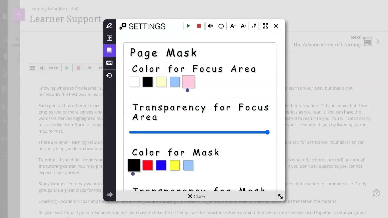 Customize the learning experience by selecting highlighting colors, reading voice and reading speed
