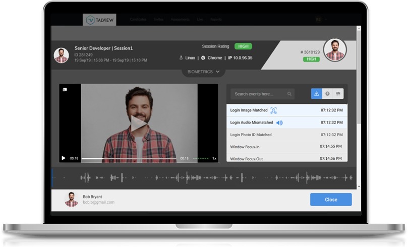 Ensure the authenticity of your candidate’s knowledge and identity through Talview's advanced online proctoring solution with a 100% seamless and unobtrusive software experience. The features of remote proctoring are: - Advanced Automated or Live Online Proctoring: Talview's system is completely automated and is always monitoring suspicious activity using advanced video and audio analytics. Our software ensures the candidate focuses on the test screen; monitors the light and other factors in the room; checks for suspicious objects and background voice activity; and watches the browser window to detect changes. Any of these will immediately red flag the test! - Cheat-Proof Online Live Tests: Administer tests that candidates can take remotely and get notified if the candidate is cheating through a detailed log of suspicious browser activity and audio-visual responses that get recorded during the interview. Prevent cheating by disabling candidates to copy/paste answers during an exam. - Face Recognition to Avoid Impersonation: Talview offers advanced facial recognition features to authenticate that your candidate is the actual person taking your exam or assessment. We provide a confidence score to help ensure a match, and our Two-Factor Authentication process helps you avoid fraudulent activity by quickly restricting test access. Talview offers support for mobile devices including iOS and Chromebooks