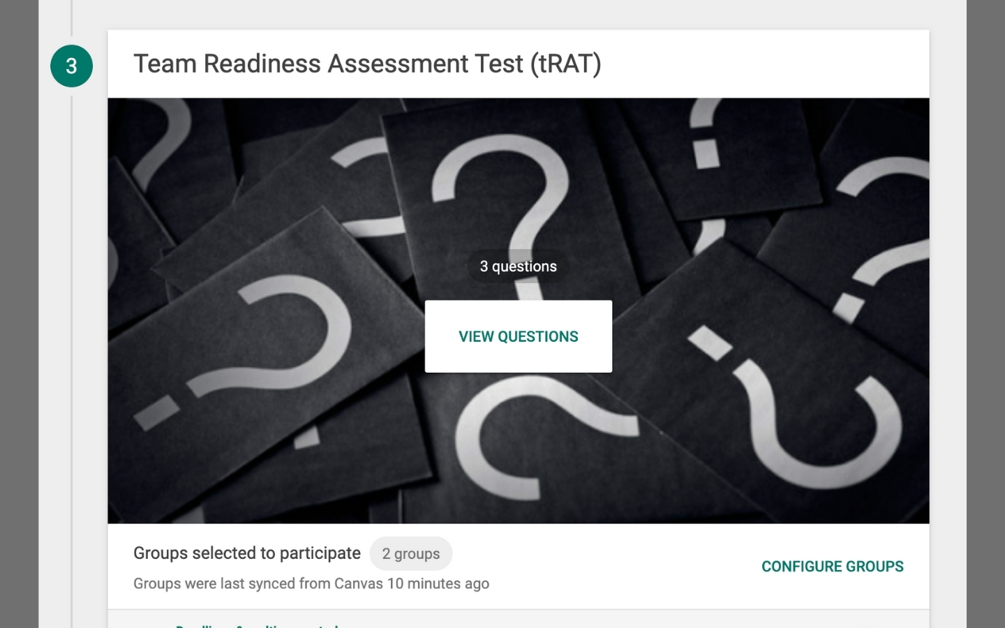 The pedagogical tool Team Based Learning enables instructors to perform the individual Readiness Assurance Test (iRAT) and team Readiness Assurance Test (tRAT) modules to prepare students for a team-based learning activity.