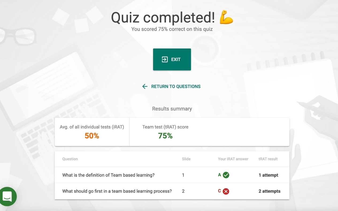 With Team Based Learning, instructors can test students' knowledge individually and as a group before a team-based learning activity. This is done in two steps which are individual Readiness Assurance Test (iRAT) and team Readiness Assurance Test (tRAT) that consist of several quiz questions.