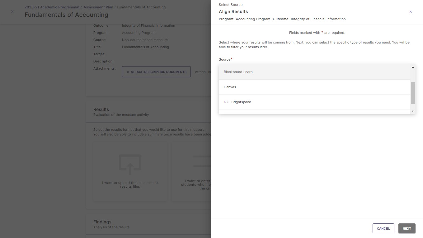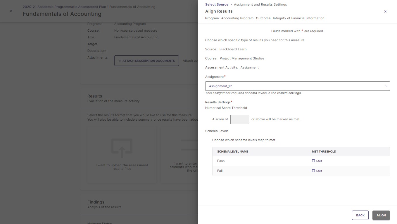 Access Blackboard Learn right from within your assessment plan in Planning & Self-Study and align the results you've captured in your courses to the relevant measures in that plan.